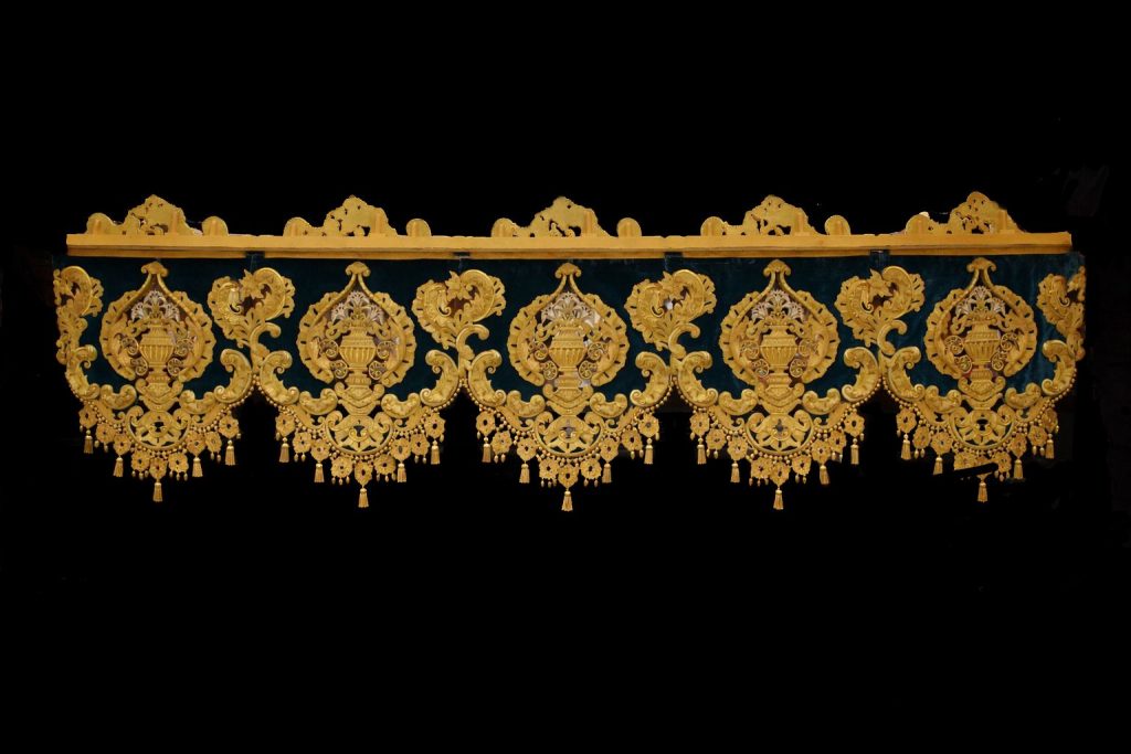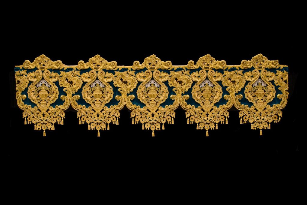 Por último las bambalinas, al igual que las anteriores ya ejecutadas, presenta un fleco original con pasamanería y piezas bordadas en oro a modo de pequeñas cartelas con espejos en su interior.