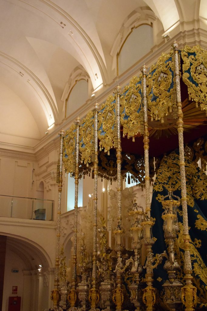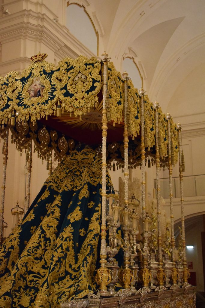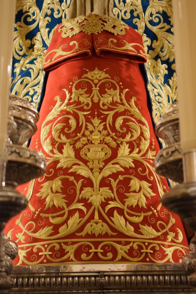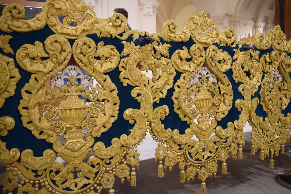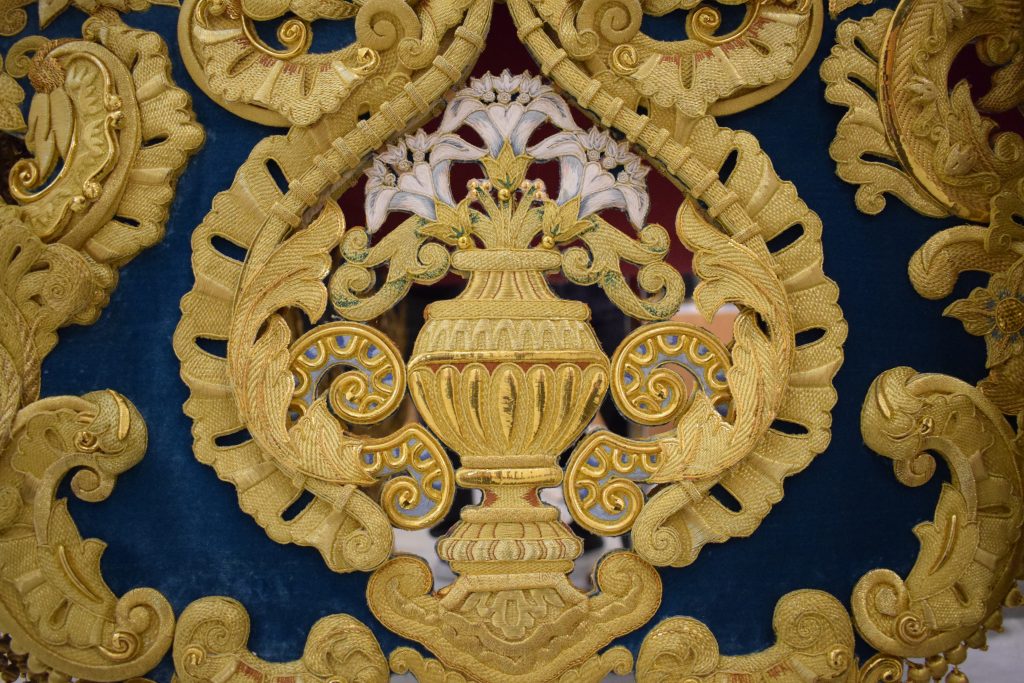 Para ello se han realizado piezas tejidas que quedan al aire y paredillas, cartulinas con un alto relieve donde se ha buscado conseguir la similitud de una talla en madera o una orfebrería con un gran volumen. Destaca la jarra de azucenas central, motivo que se repite en cada entrevaral de las bambalinas, donde este se encuentra bordado al aire; es decir sin soporte de terciopelo.