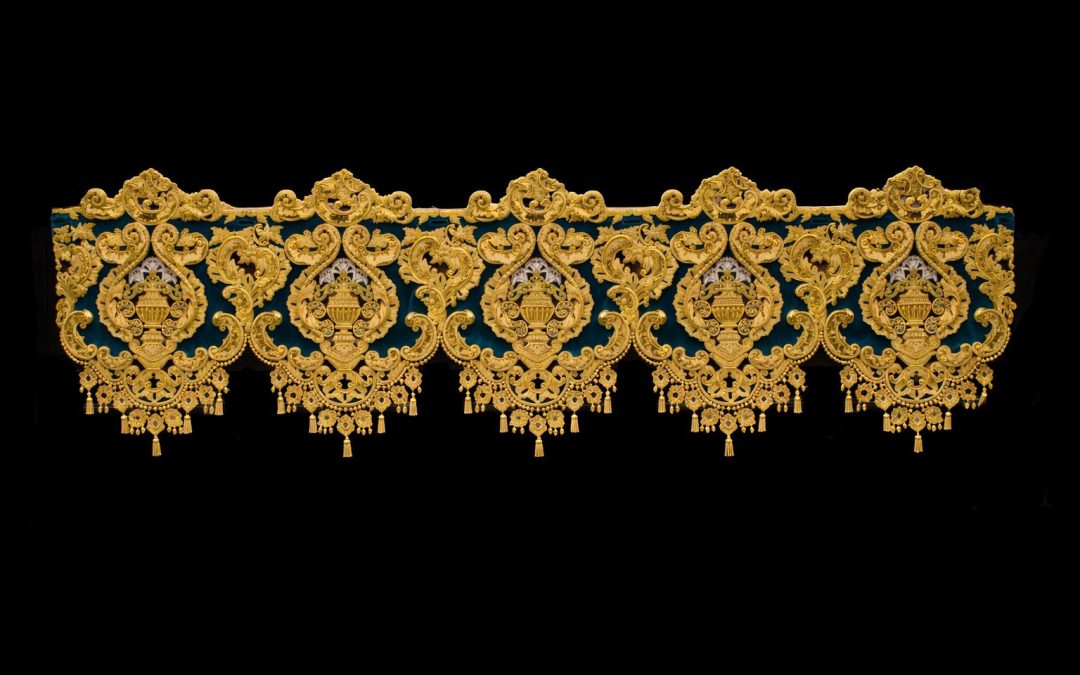 Por último las bambalinas, al igual que las anteriores ya ejecutadas, presenta un fleco original con pasamanería y piezas bordadas en oro a modo de pequeñas cartelas con espejos en su interior.